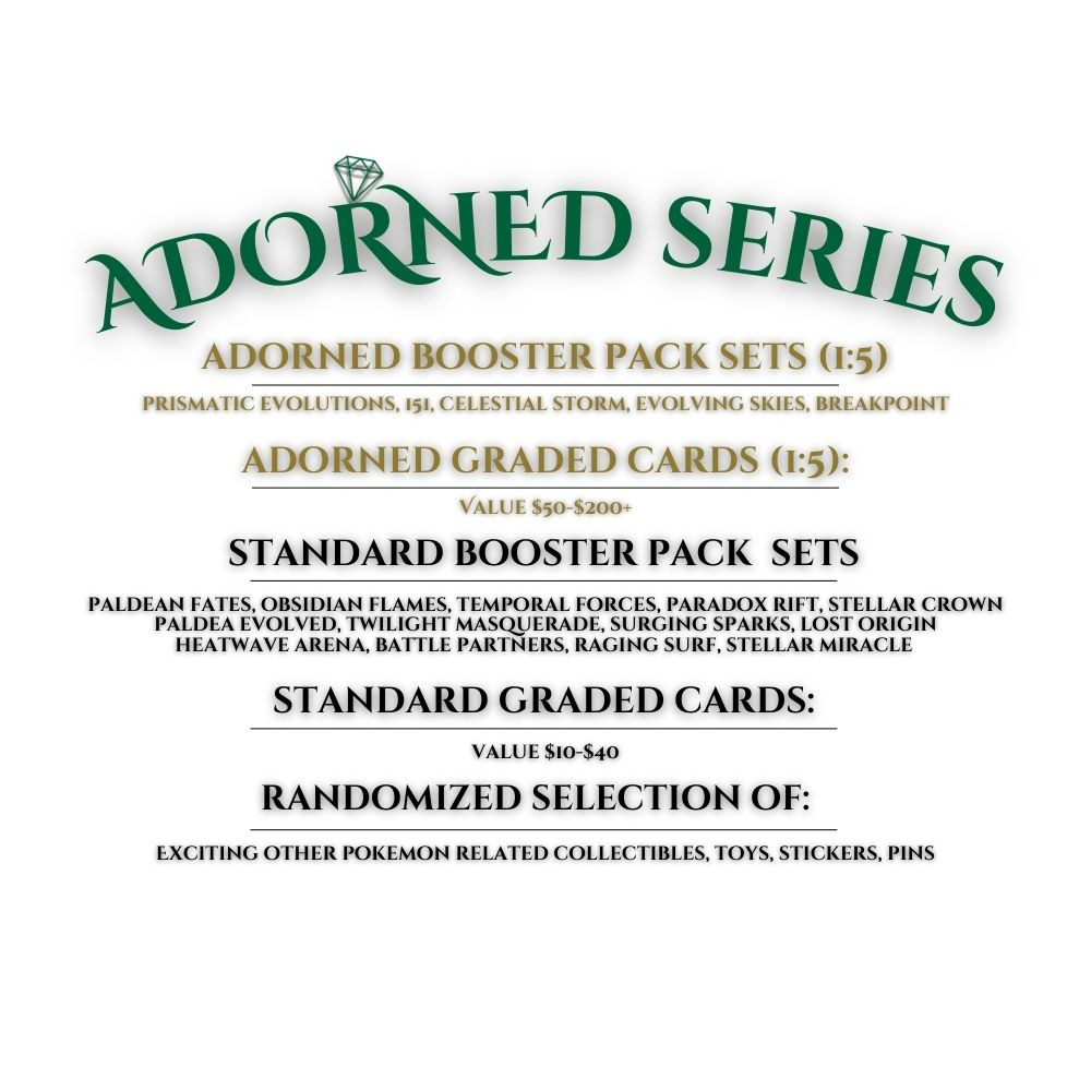 Adorned Tier Booster Packs are selected at random but are always made up of the following sets; Evolving Skies, 151, Sun & Moon Celestial Storm, Prismatic Evolutions, XY Breakpoint